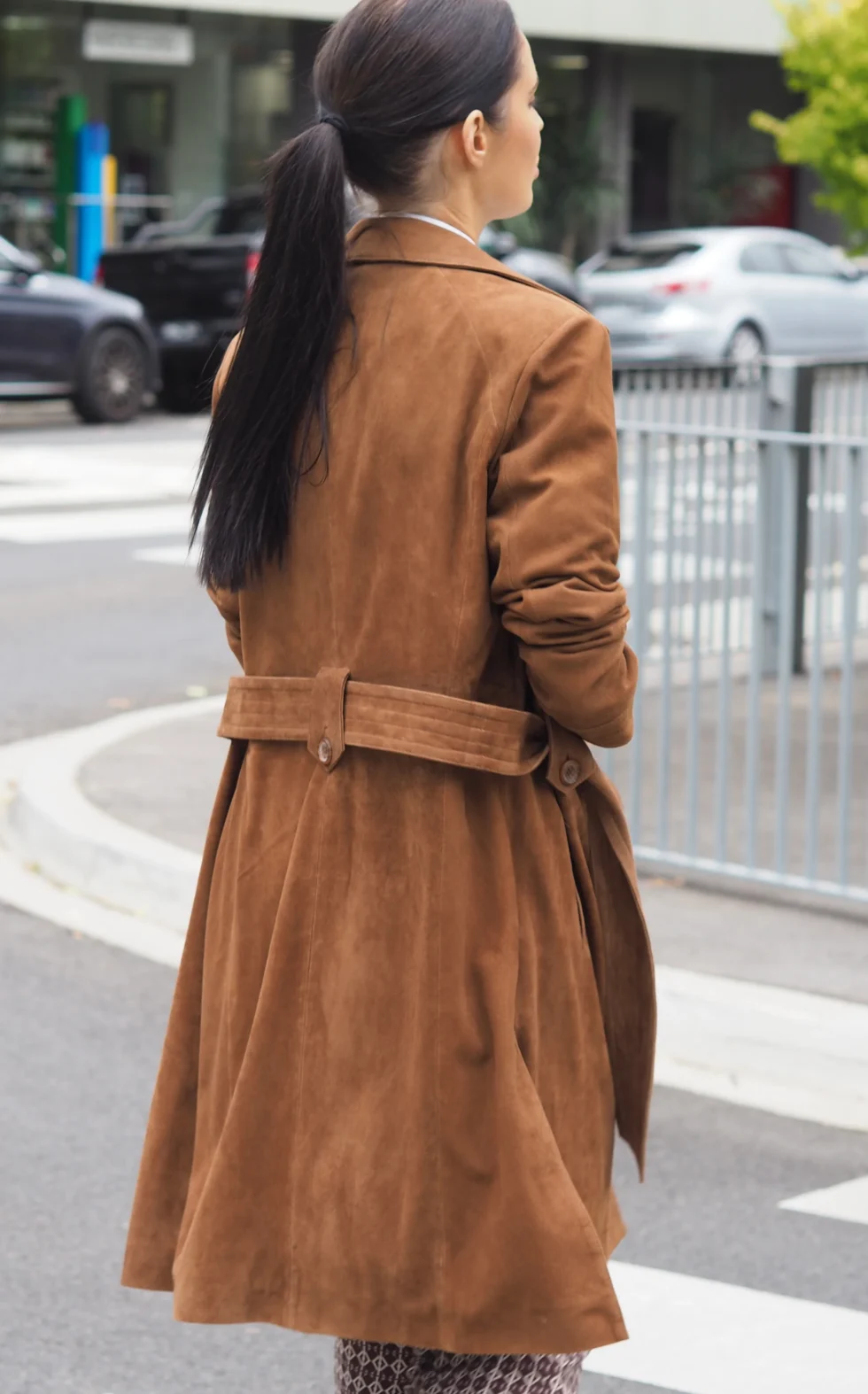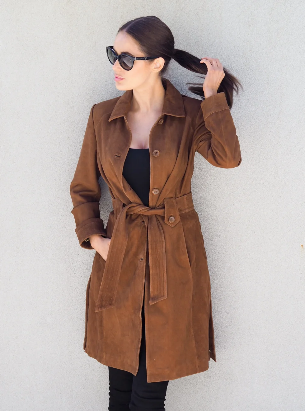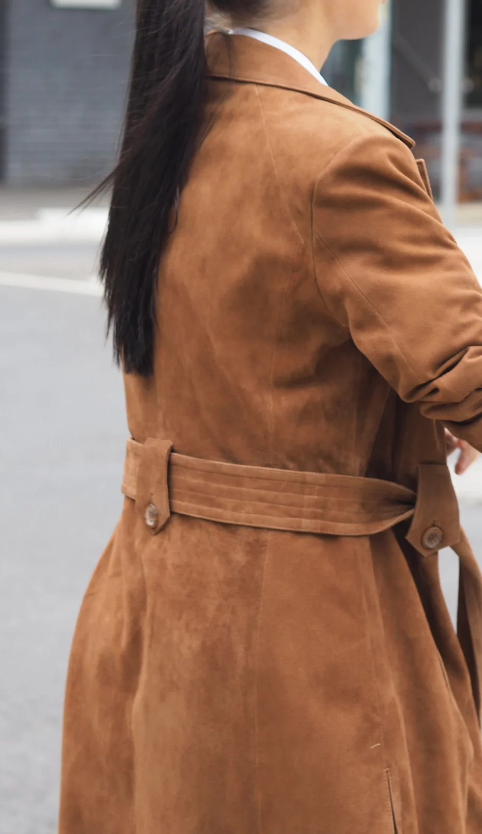 A stunning tan soft suede trench coat that is sure to get you noticed