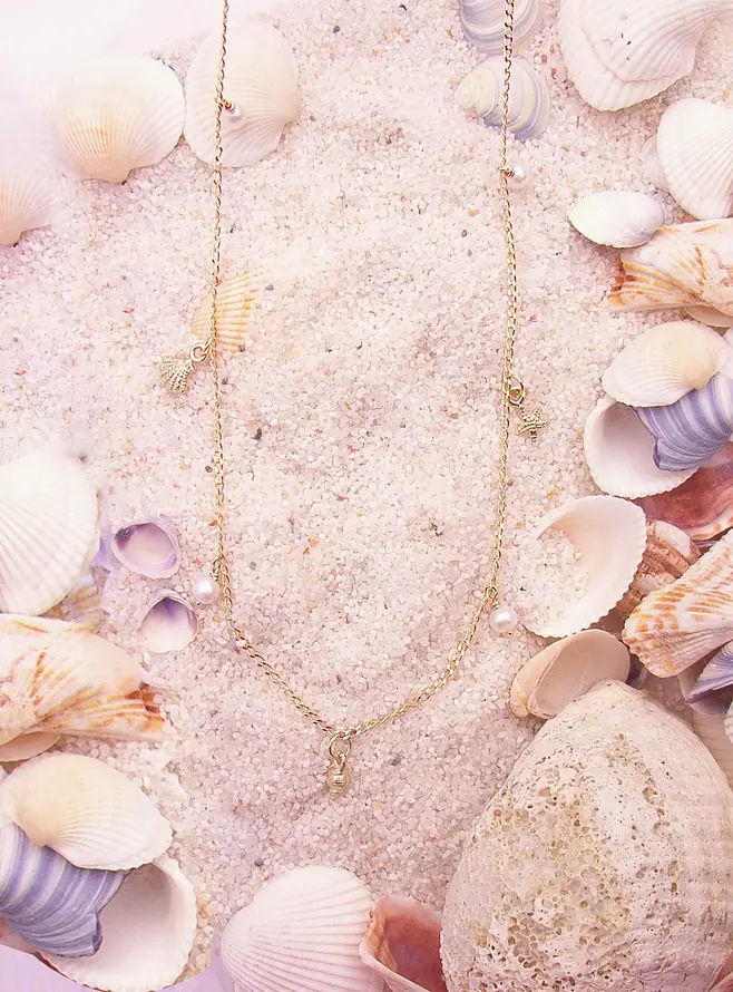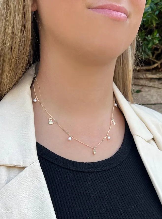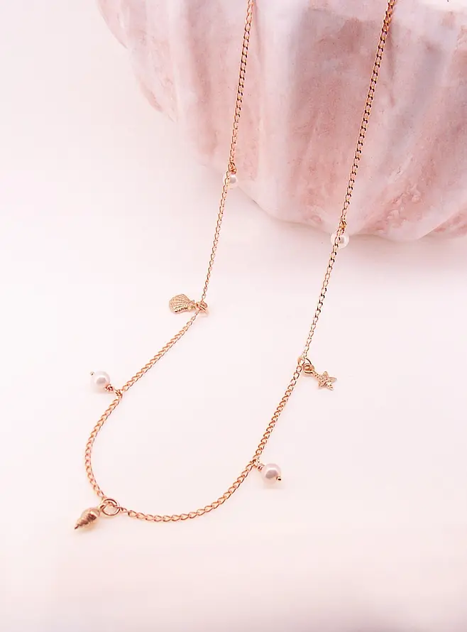 Coco Seaside Pearl Charm Station Necklace in 9ct Rose Gold