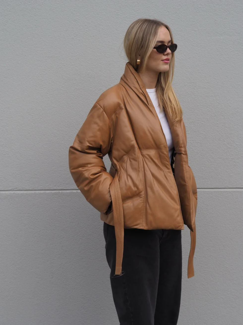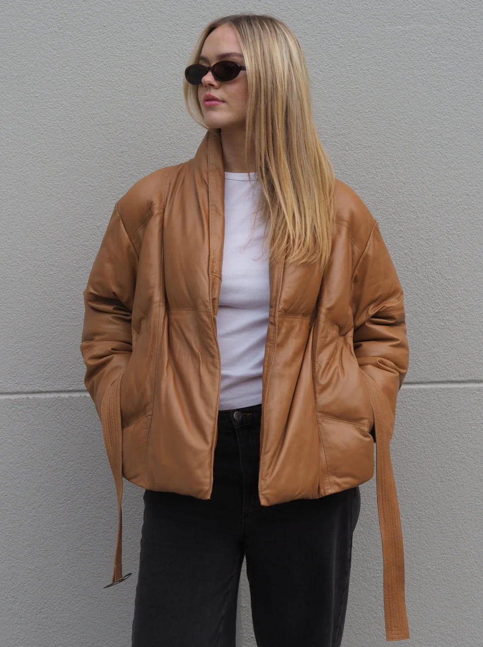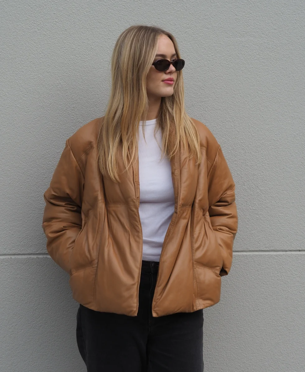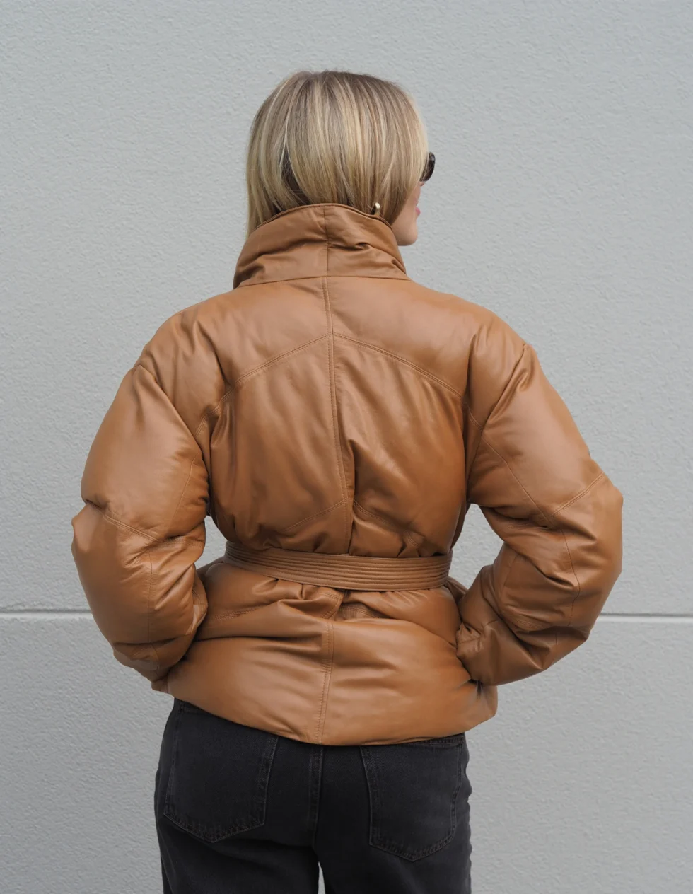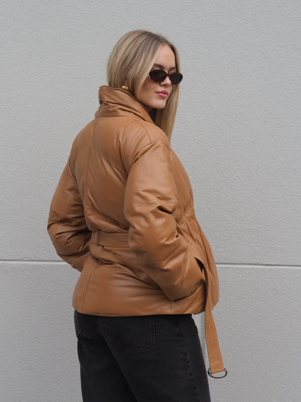 Keep those winter blues away in this stunning all leather belted puffer jacket