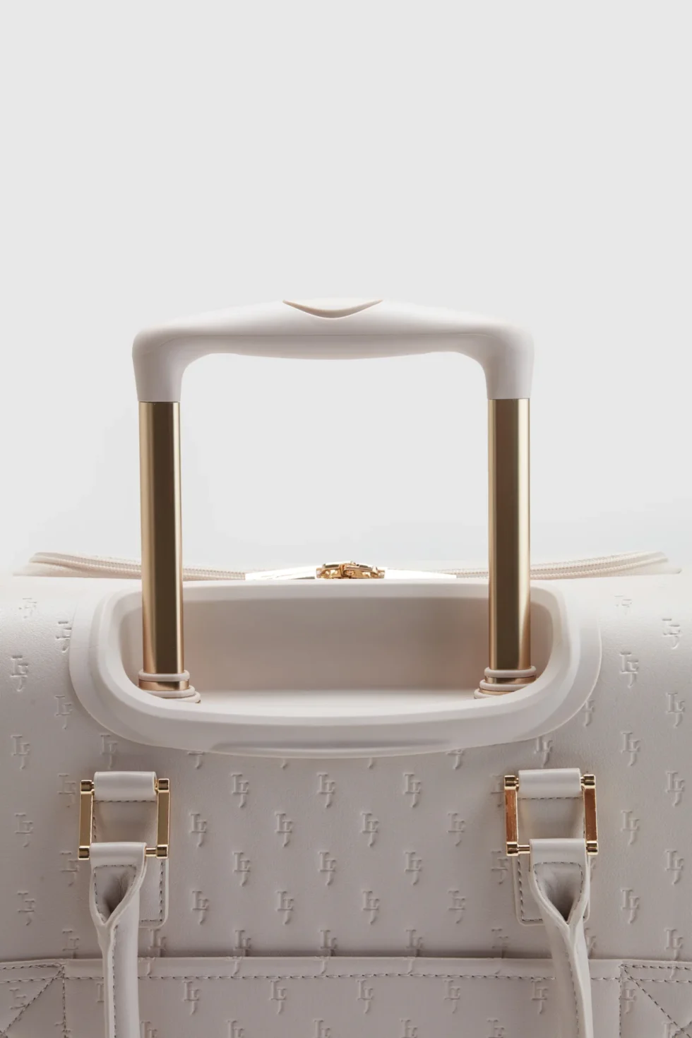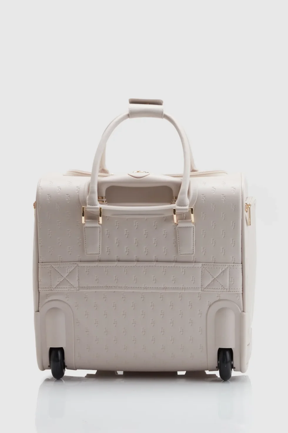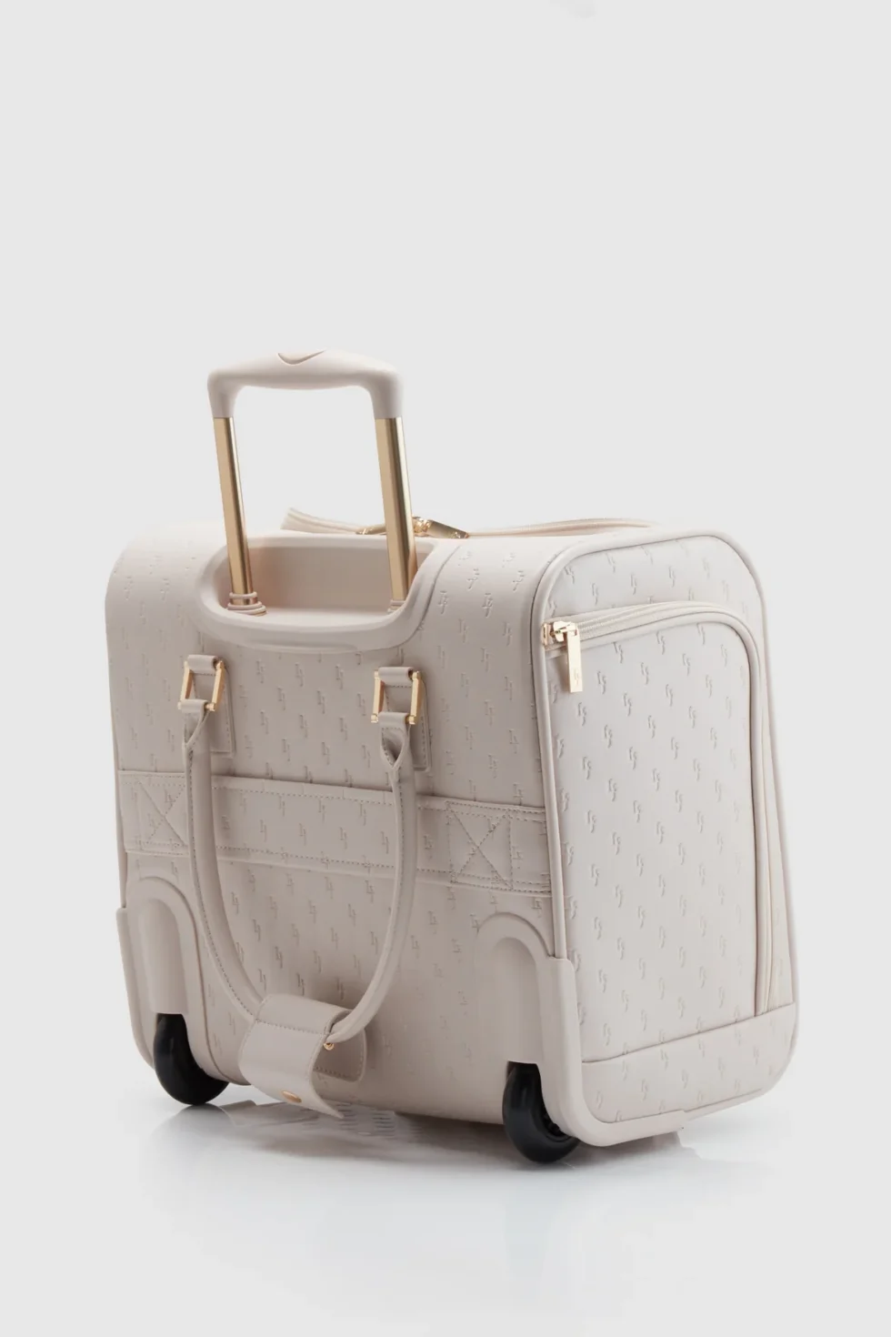The embossed under seat bag complements the handbag range. This under seat bag is designed to be both compact and spacious, with two wheels and a trolley slide for smooth travels. Additionally, it includes two carry handles for convenient lifting.