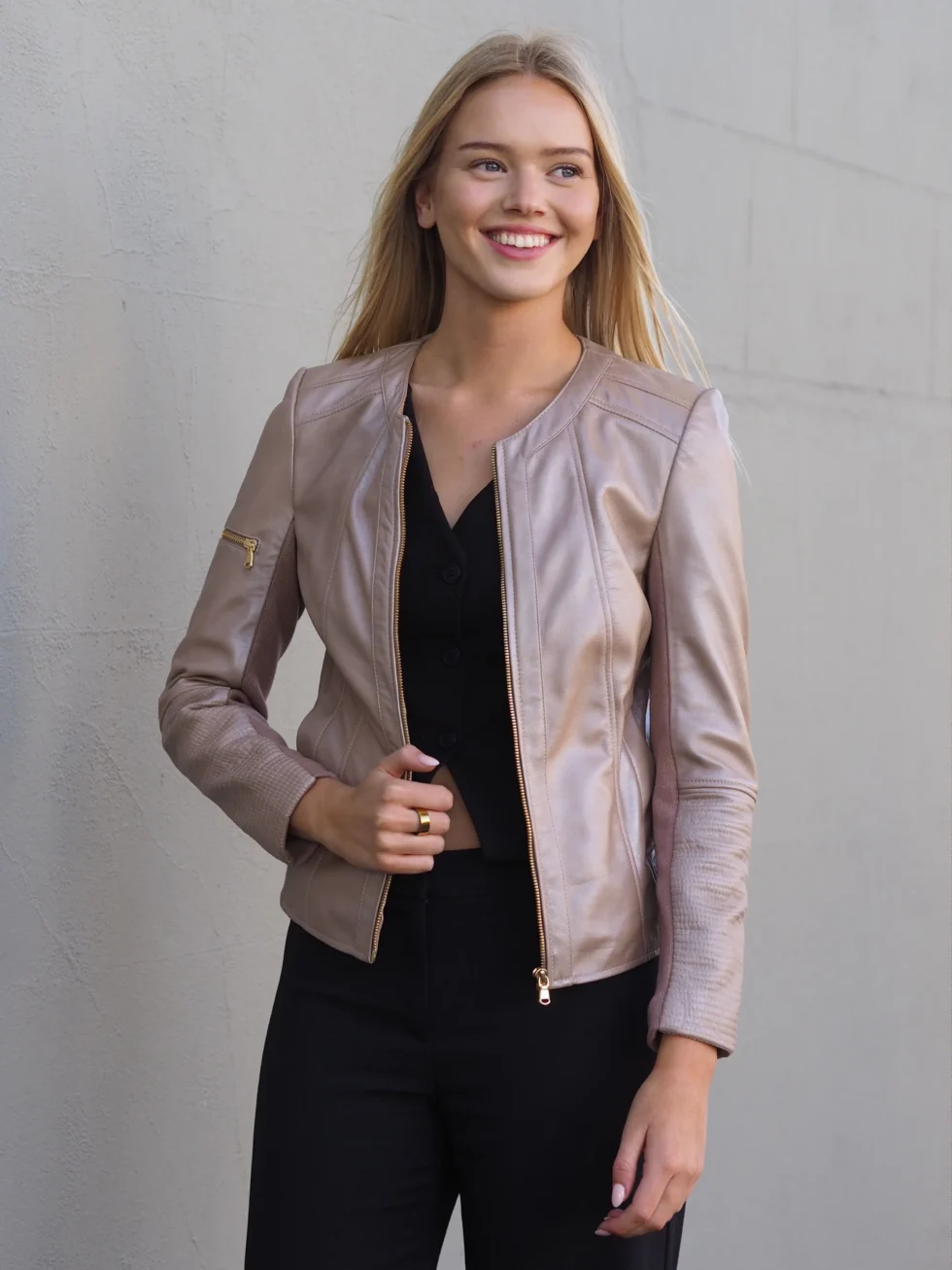 Metallic leather in a soft champagne color upscales this stunning leather jacket
