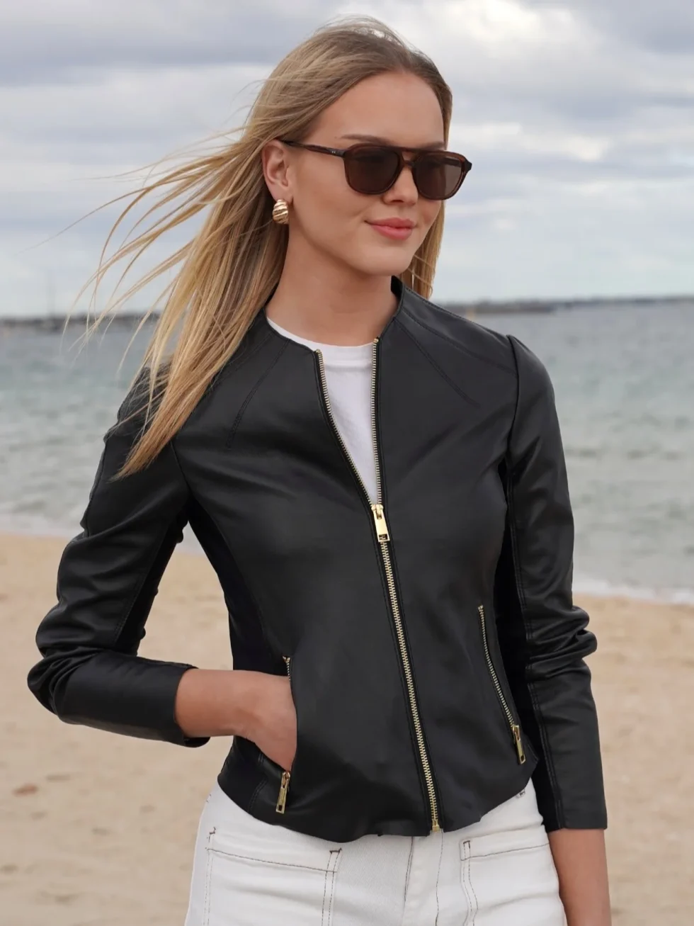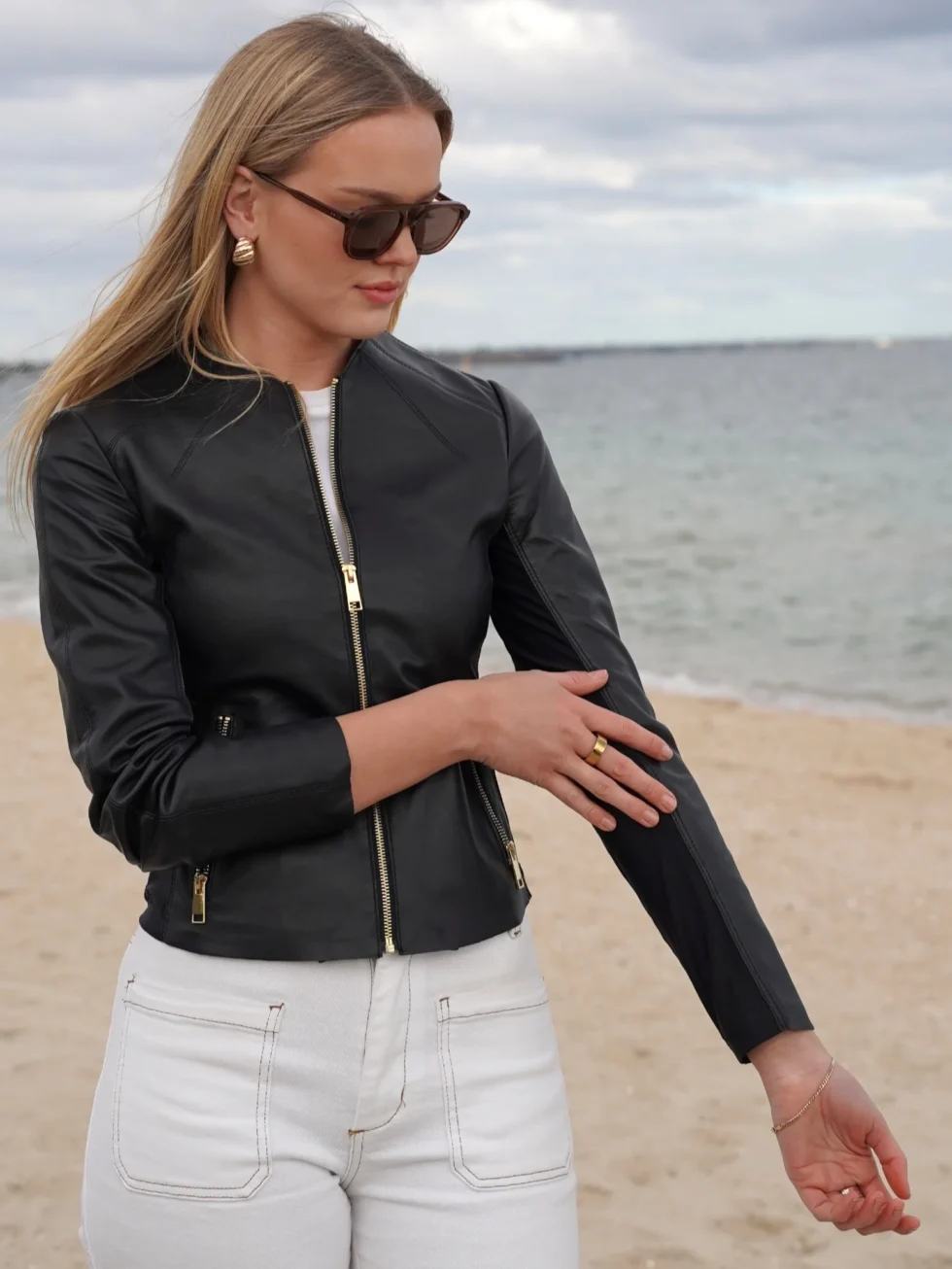 The soft leather combined with knit panels make the Kristen an elegant and sophisticated fitted leather jacket