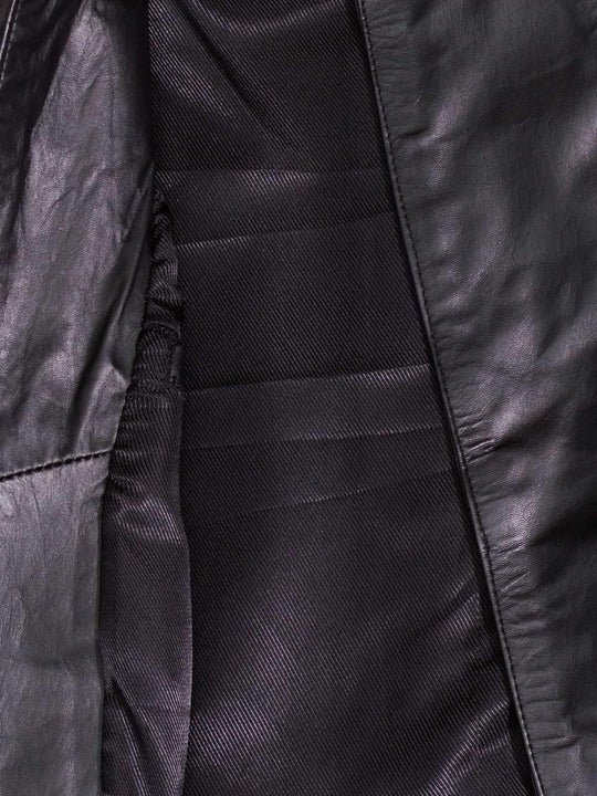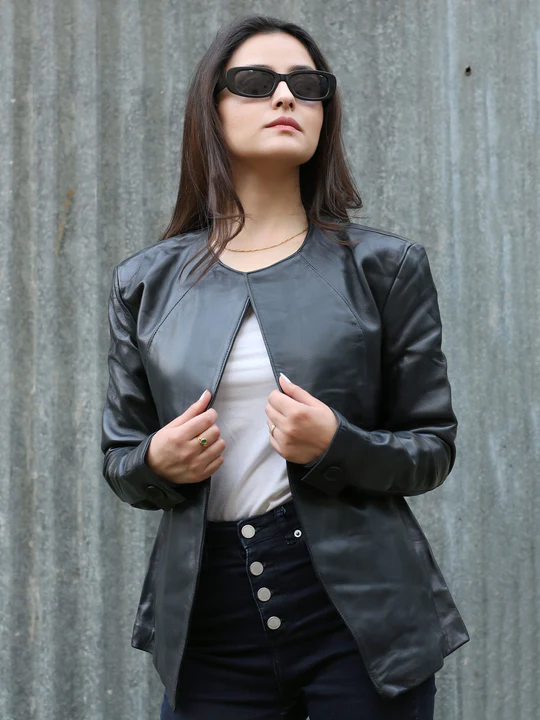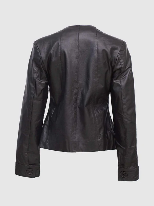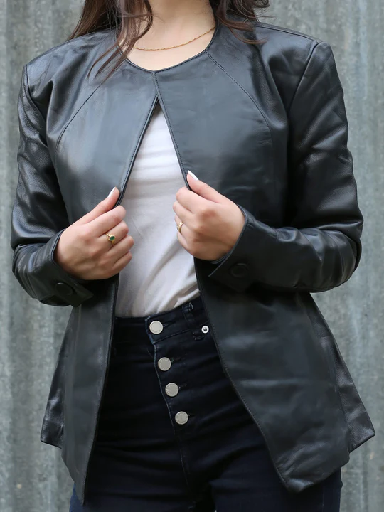 Presenting to you “Timeless Women Black Open Front Collarless Jacket“ a smart and elegant piece. Made with 100 % real sheep leather, the quality is so fine that you can feel the smoothness. Its stitching is perfect and looks even more better with the Black shade, though you can go for other shades available. It is Internally fully lined which gives it a plus boost.