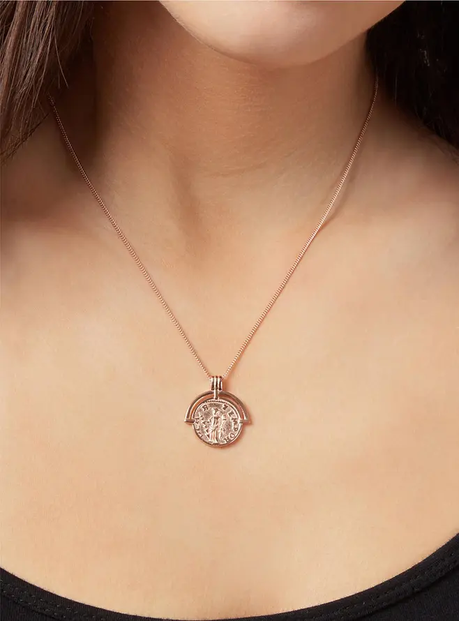 Delicate in design, this necklace features an eye-catching engraved coin pendant as its centrepiece placed on a fine, lightweight chain.