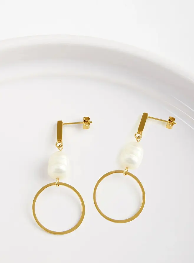 Its timeless stud style earrings feature an open circle ring at the end of the drop for a touch of class.